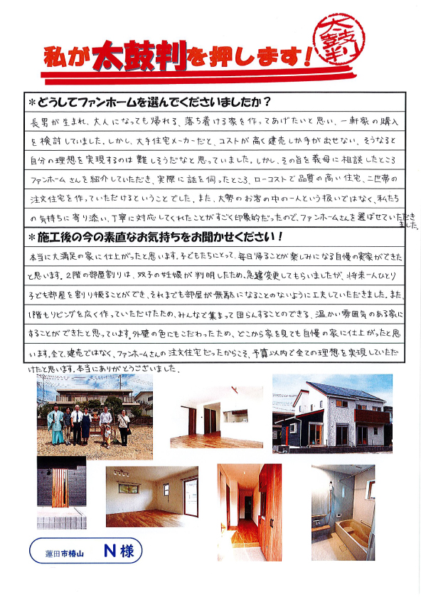 ファンホームさん、業者の皆さんが一つ一つ手作りしていただいた家をこれから大切にしていきたいです。
